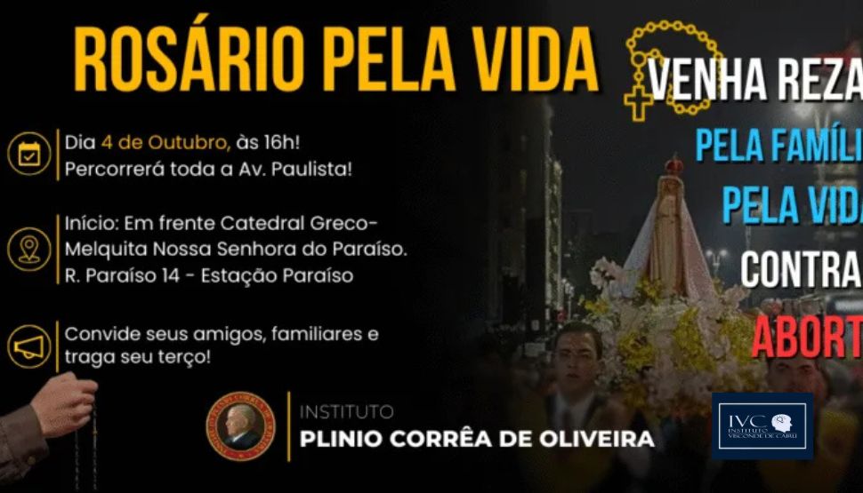 Neste sábado, 04 de outubro de 2025, o Instituto Plínio Corrêa de Oliveira (IPCO) e de outras associações católicas e pró-Vida realização o Rosário pela Vida. Uma manifestação contra o aborto, um pecado mortal segundo a Doutrina Católica. Porém, todos os pró-Vida são bem-vindos a participar.